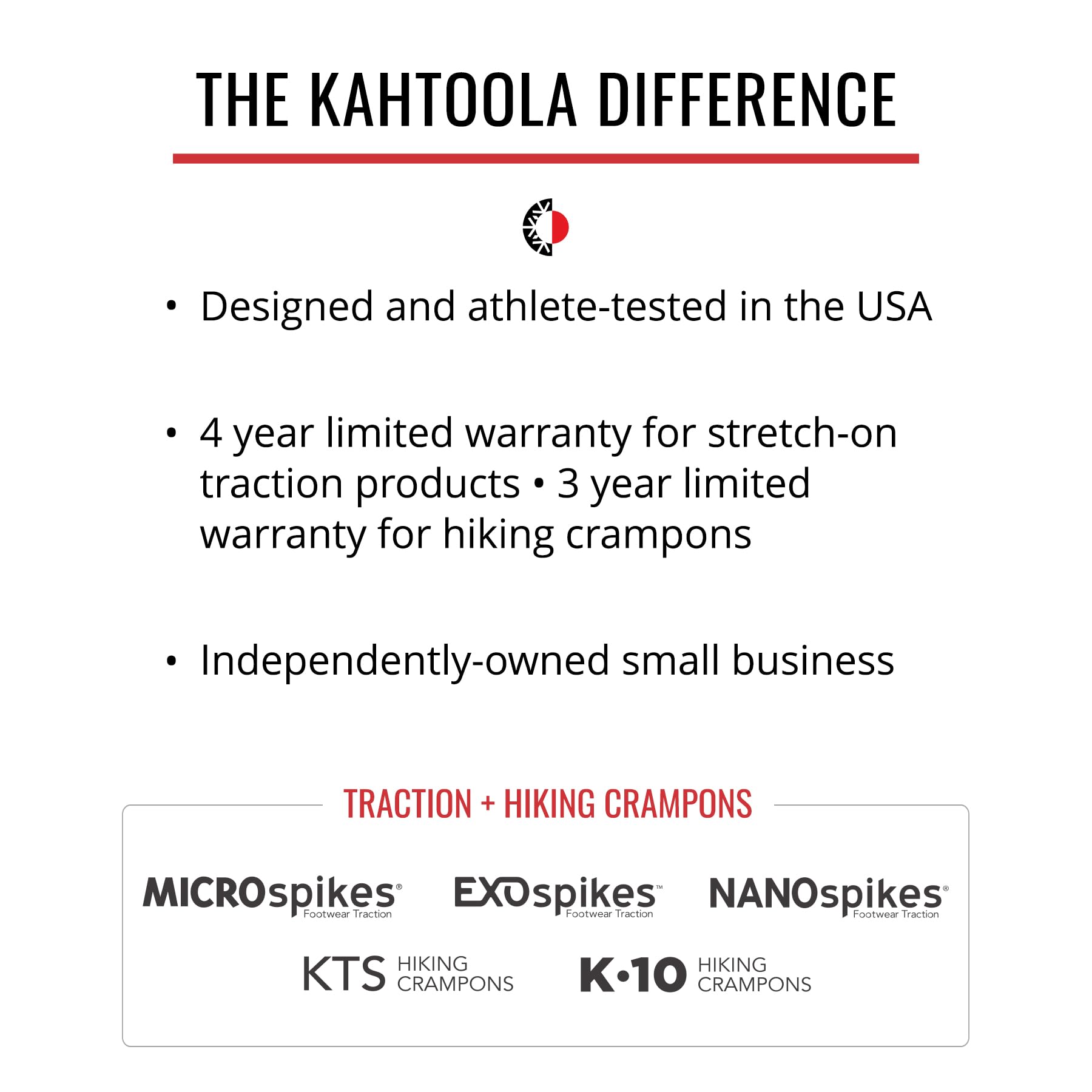 - KAHTOOLA: Est. in 1999 Kahtoola is on a mission to build exceptional products that make the outdoors more accessible and rewarding. Please see sizing chart in product images. 4-year manufacturer warranty. Shoes not included. All Kahtoola traction devices are manufactured in Taiwan.