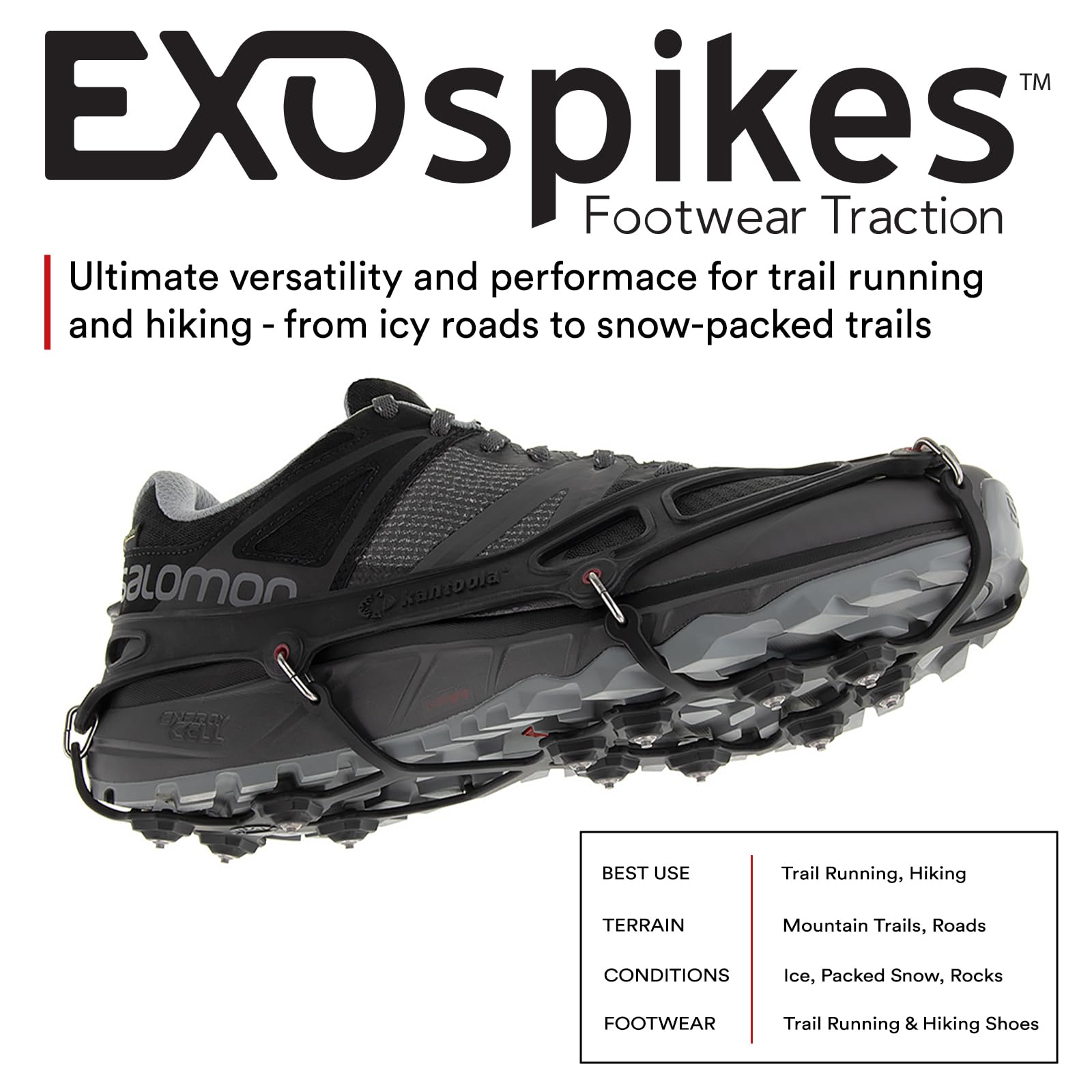 - BEST FOR: Winter hiking, backpacking, and trail-running. EXOspikes footwear traction are designed to be lightweight and abrasion resistant, enabling users to take on a mix of terrain and conditions—including frozen mountain trails, icy roads, and everything in between on your backcountry winter adventures! Ideal for hiking shoes and boots and to be used on mountain trails.