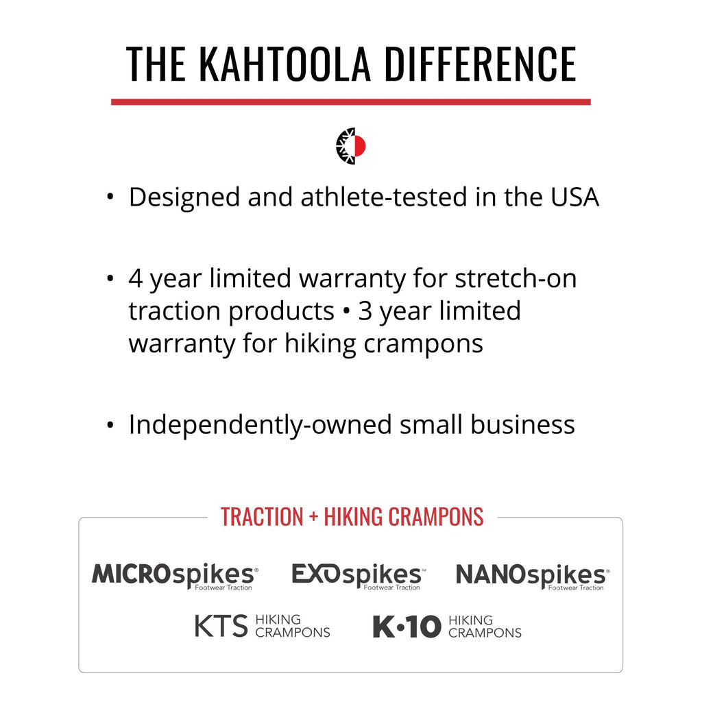 • KAHTOOLA: Est. in 1999 Kahtoola is on a mission to build exceptional products that make the outdoors more accessible and rewarding. Please see sizing chart in product images. 4-year manufacturer warranty. Shoes not included. All Kahtoola traction devices are manufactured in Taiwan.