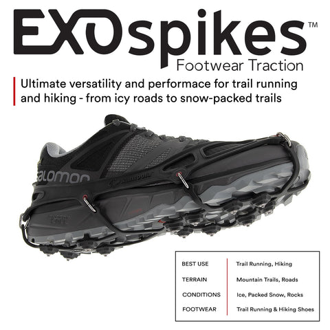 • BEST FOR: Winter hiking, backpacking, and trail-running. EXOspikes footwear traction are designed to be lightweight and abrasion resistant, enabling users to take on a mix of terrain and conditions—including frozen mountain trails, icy roads, and everything in between on your backcountry winter adventures! Ideal for hiking shoes and boots and to be used on mountain trails.